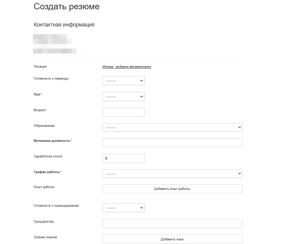 В начале, личная информация о вас, заполнится автоматически из вашего личного кабинета. После этого пункт (Локация), тоже заполняется автоматически, но вы можете поменять город. Для этого нажмите на город находящийся в пункте (Локация) у вас появится перечень субъектов. Выберите и нажмите на ту область, в которой вы находитесь. После этого появится перечень городов, выберите Ваш город. После того, как вы выберите свой город, страница вернется к окну создания резюме.