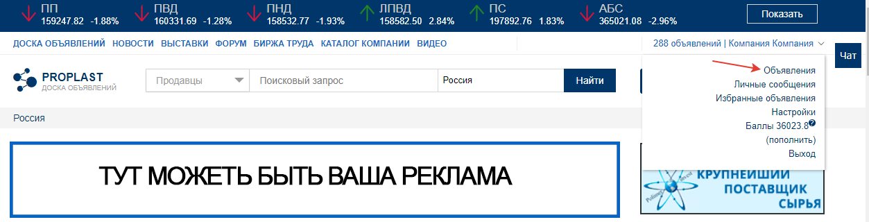 ШАГ 1: В правом верхнем углу находится название вашего аккаунта или название вашей компании, нажмите на него. Из предложенного списка выберите "Объявления".