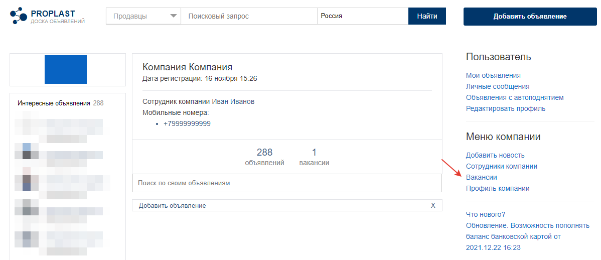 ШАГ 2: Перед вами появится новое окно со списком ваших объявлений и информация о компании или пользователе. Нажмите на раздел "Вакансии" в "Меню компании" как указано на скриншоте.