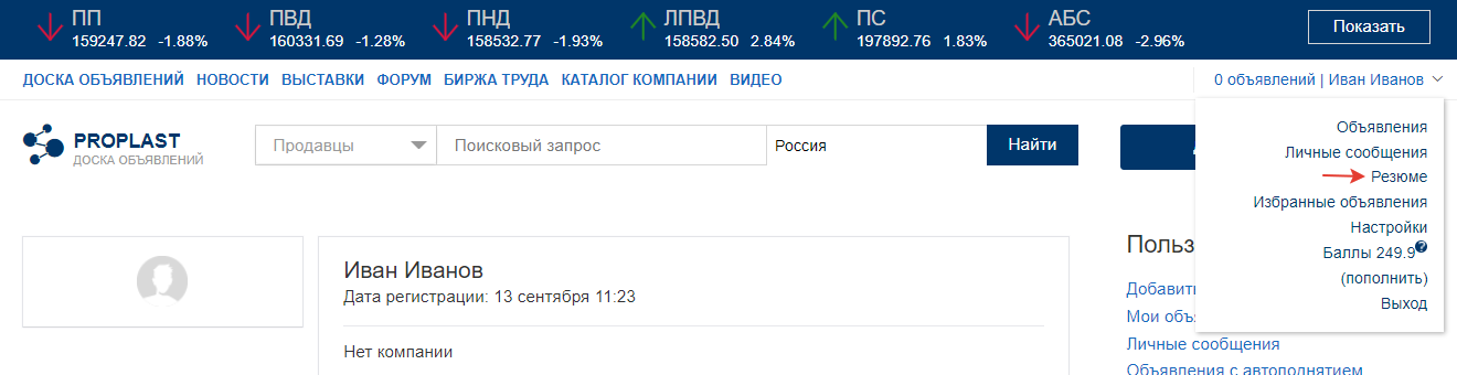 ШАГ 1: В правом верхнем углу находится название вашего аккаунта, нажмите на него. Из предложенного списка выберите "Резюме".