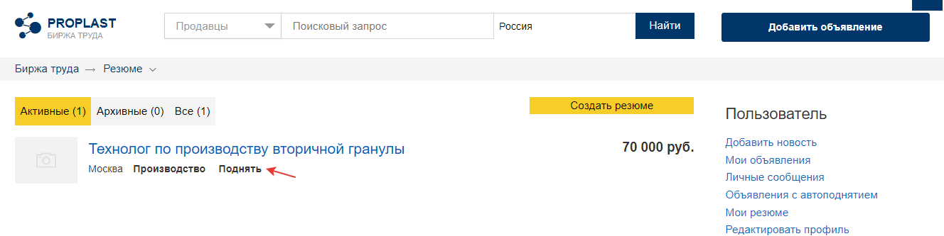 ШАГ 2: Перед вами появится новое окно со списком ваших резюме. Около активных резюме есть кнопка "поднять". Нажмите на неё. Вы получите уведомление об успешном поднятии резюме.